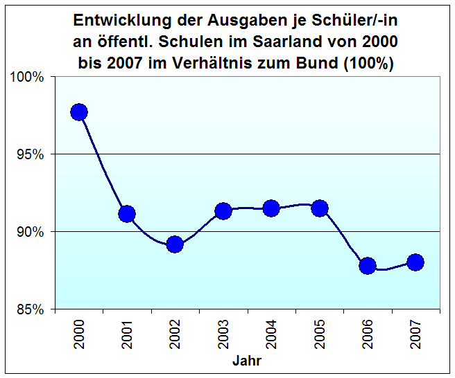Während im Bund die Ausgaben je Schüler im Jahr 2007 (5.000 €) um 16 % gegenüber 2000 (4.300 €) höher lagen, erreicht das Saarland 2007 (4.400 €) noch nicht einmal das durchschnittliche Niveau der Bundesländer aus dem Jahr 2001 (4.500 €) und fällt im Bundesvergleich immer weiter ab.